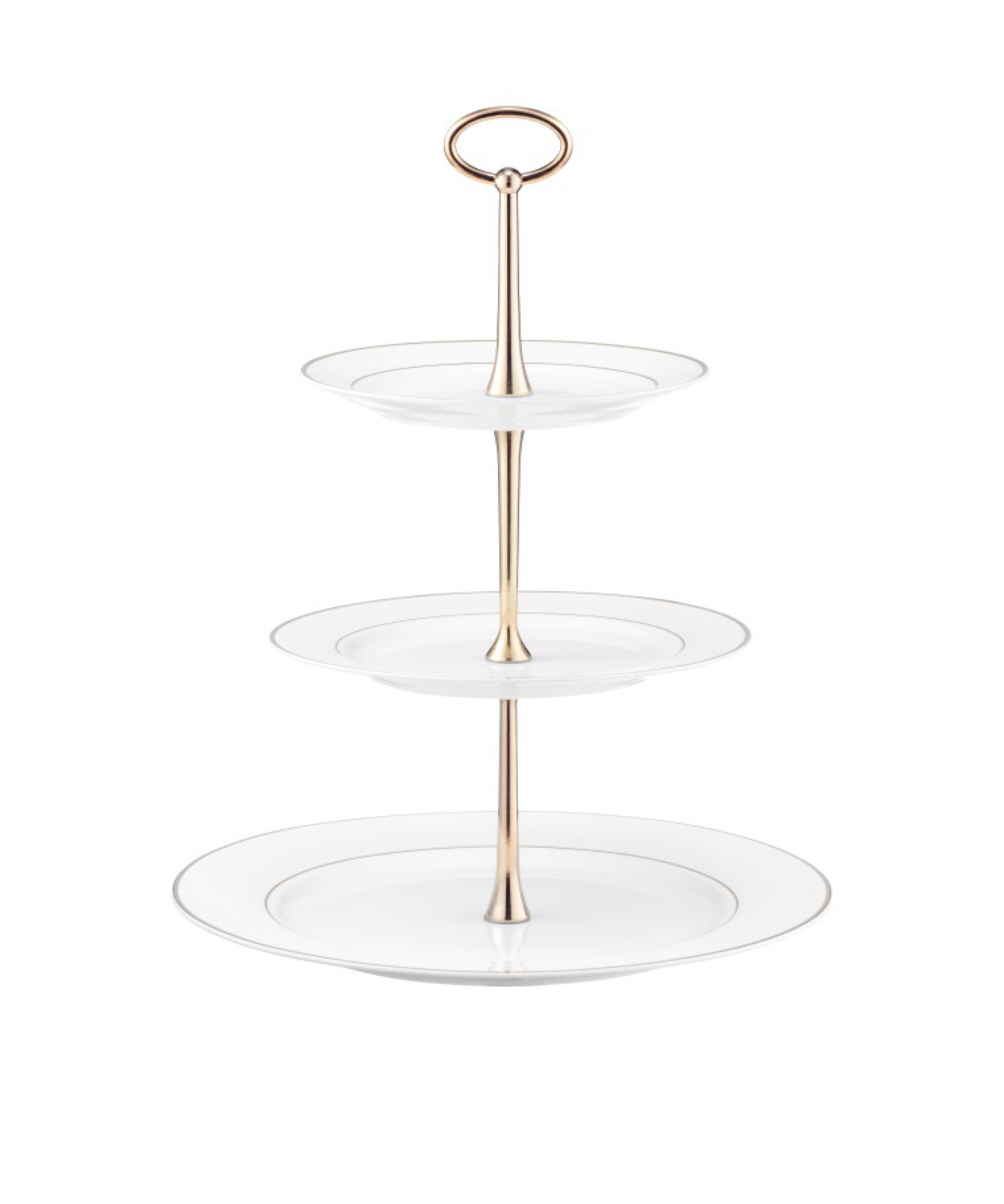 Patera trzypoziomowa z kolekcji Aura Gold to doskonały sposób na efektowne podanie ciast, ciasteczek oraz owoców. Świetnie sprawdzi się podczas spotkań w gronie najbliższych i będzie świetnie prezentować się na stole. Patera posiada stylowy uchwyt ułatwiający przenoszenie.