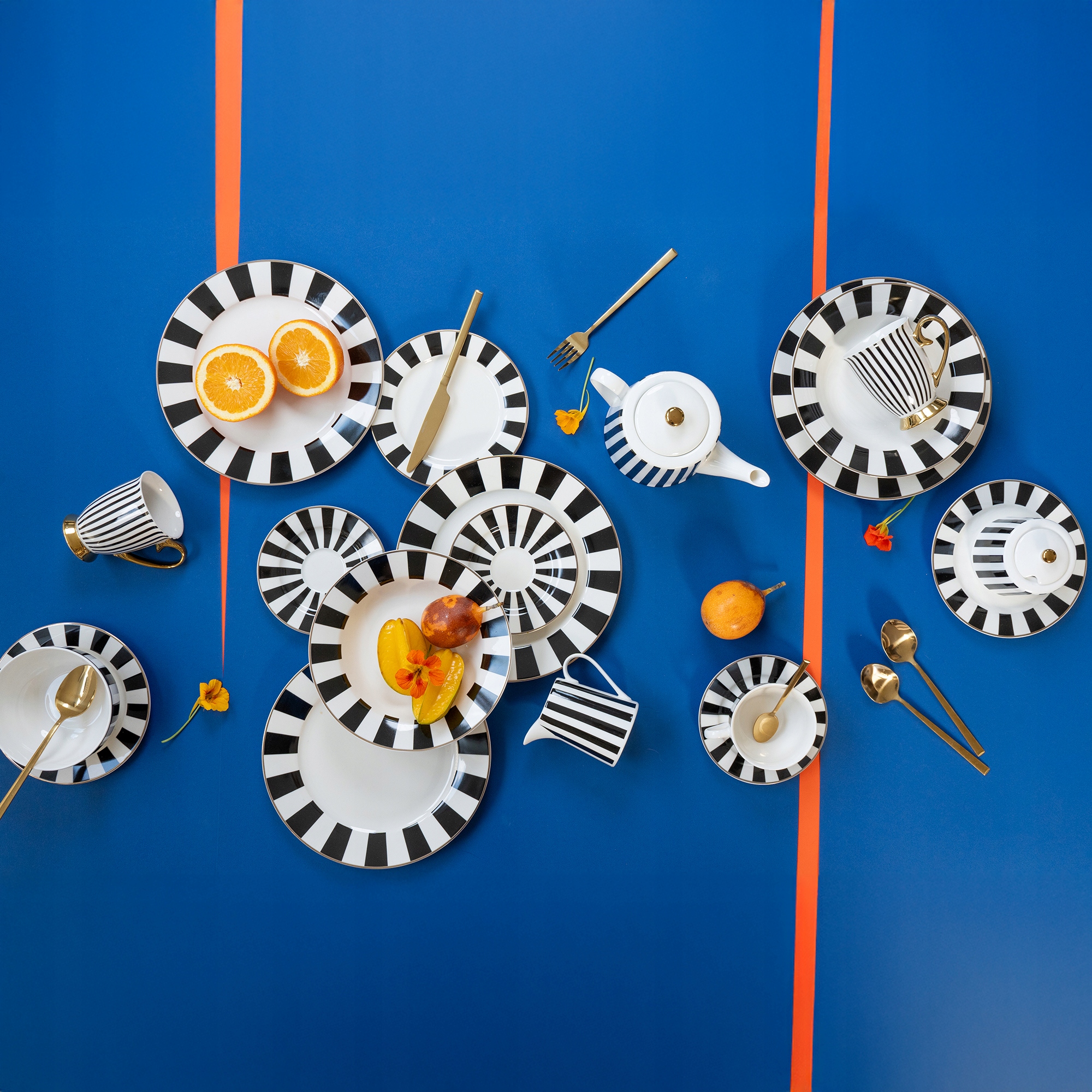 Potrzebujesz małego talerzyka, który przyciągnie uwagę gości? Talerz Ribs o średnicy 15 cm sprawdzi się doskonale. To klasyka w nowoczesnym wydaniu – czarno-białe pasy i złote detale nadają mu wyjątkowy charakter, a inspiracja paryską elegancją czyni go niezwykle szykownym dodatkiem do stołu.