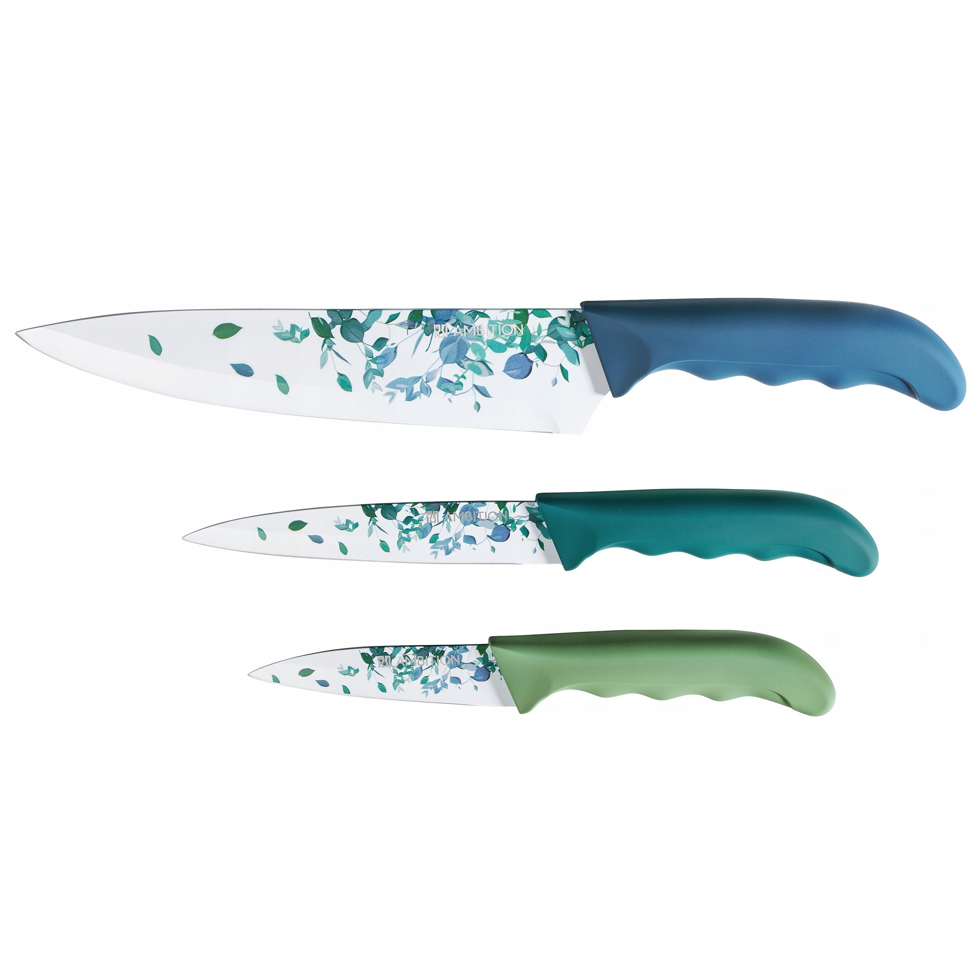 Komplet noży z kolorowymi rączkami, niezbędny w każdej kuchni. W zestawie znajdują 3 najpopularniejsze rodzaje noży. Doskonale wyprofilowana wyprofilowana rączka zapewnia wygodny i stabilny chwyt. Ostrze noży jest pokryte powłoką nieprzywierającą, co zdecydowanie ułatwia krojenie i czyszczenie.