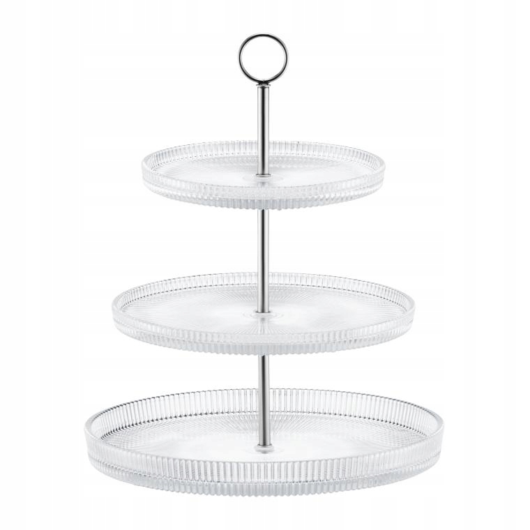 Trzypoziomowa patera Curly w srebrnym wykończeniu to doskonały wybór do stylowego serwowania ciast, ciasteczek, owoców czy przekąsek. Wykonana z transparentnego, ryflowanego szkła, pięknie eksponuje podane smakołyki, a srebrne detale dodają nowoczesnego charakteru. Idealna zarówno na eleganckie przyjęcia, jak i codzienne spotkania przy kawie.
