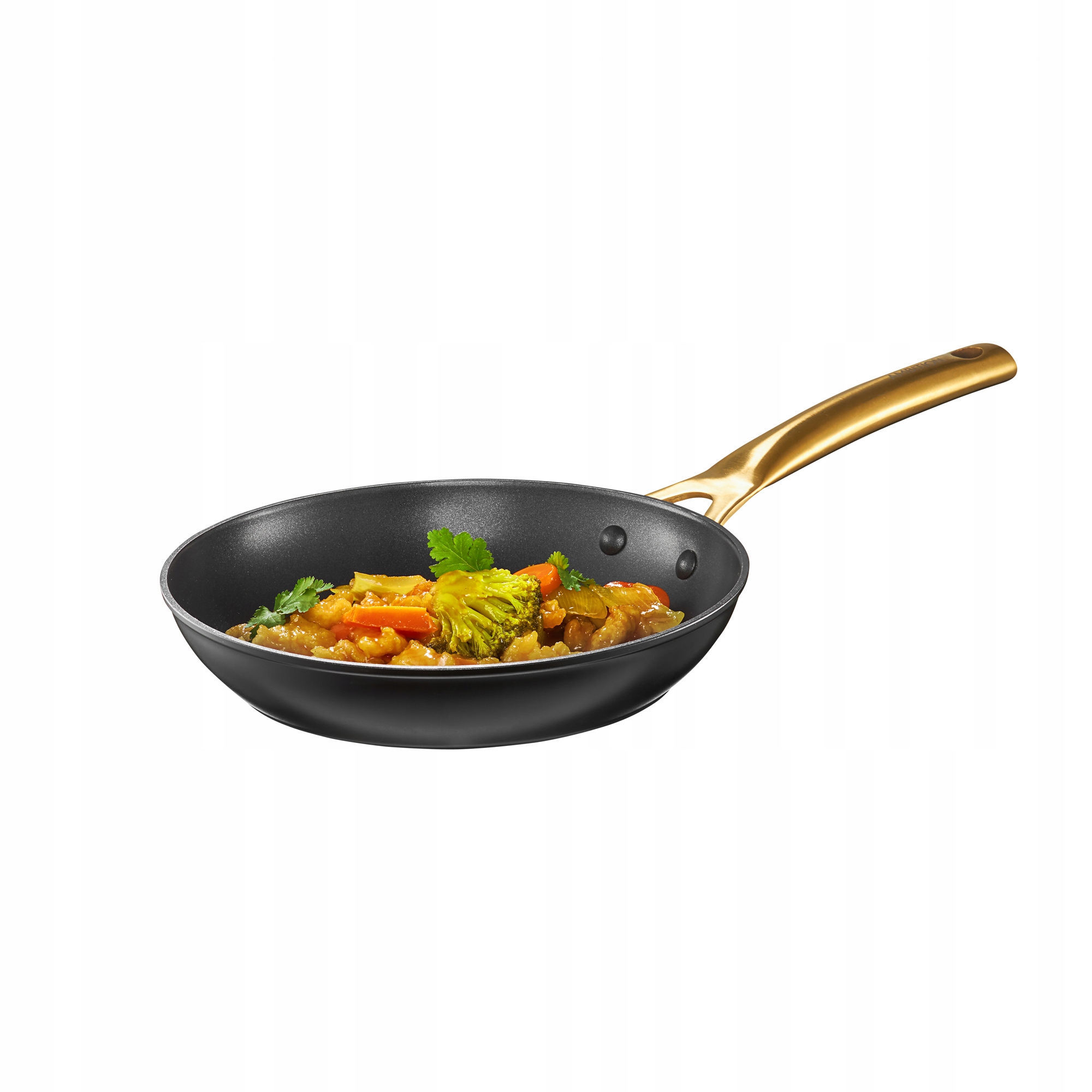 Luksusowy design: Czarna patelnia z rączką w kolorze imitującym złoto, wykonaną w technologii PVD.