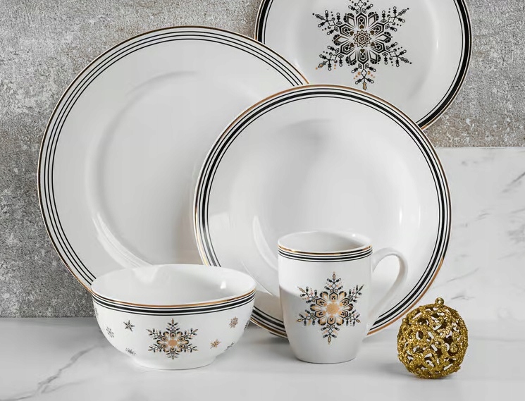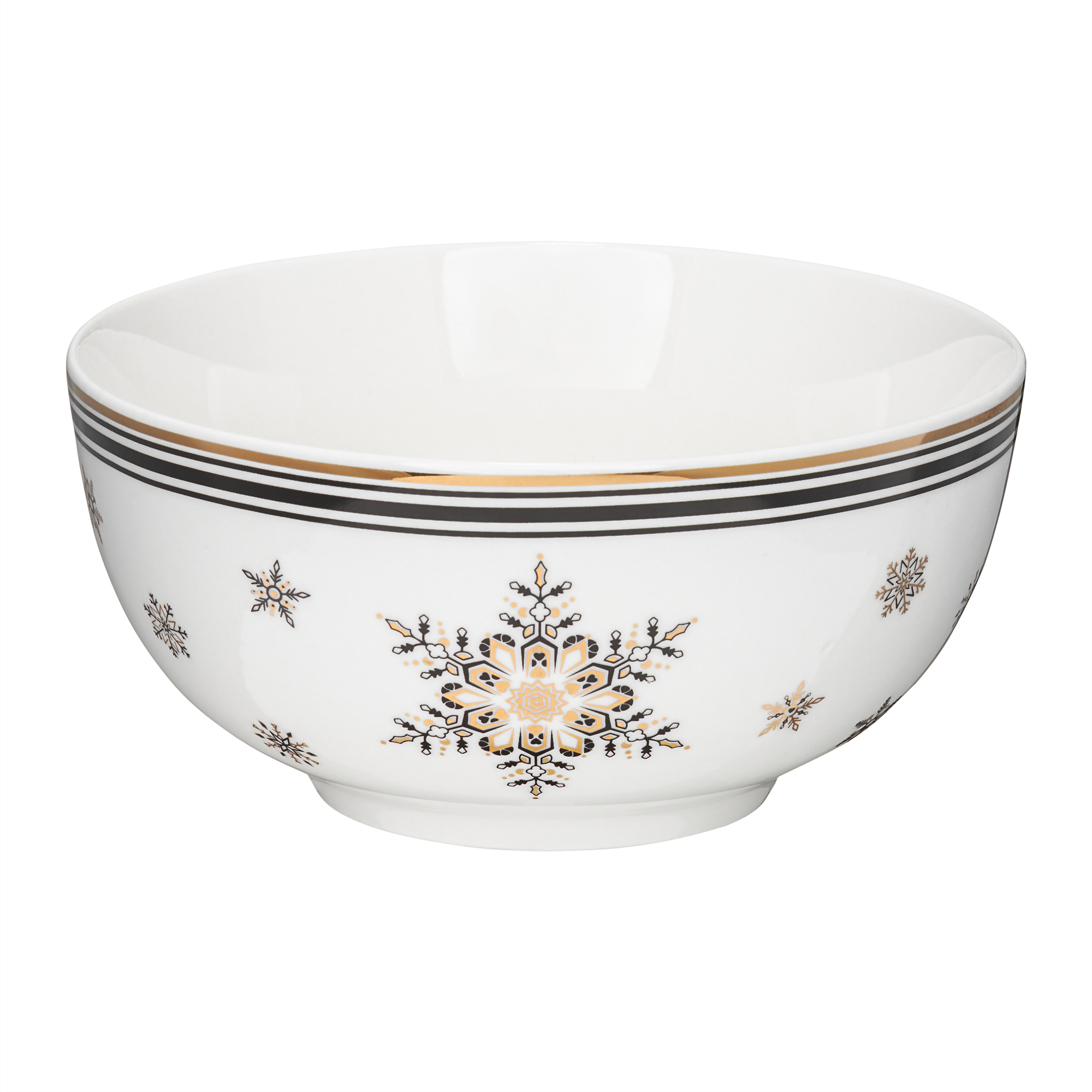 Porcelanowa miseczka z delikatnym wzorem śnieżynek w stylu art deco to idealne połączenie estetyki i praktyczności. Centralna duża śnieżynka, otoczona subtelnymi, mroźnymi gwiazdkami, tworzy wyjątkowy design, który przyciąga wzrok. Złoto-czarny rant dodaje wyrafinowanego charakteru, sprawiając, że naczynie prezentuje się niezwykle efektownie na każdym stole. Ta miseczka to nie tylko naczynie do podawania sałatek, owoców, czy deserów, ale także małe dzieło sztuki, które wzbogaci każde wnętrze.