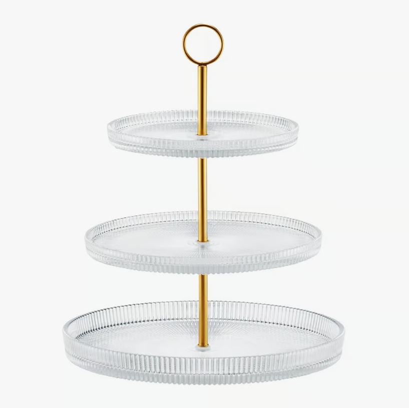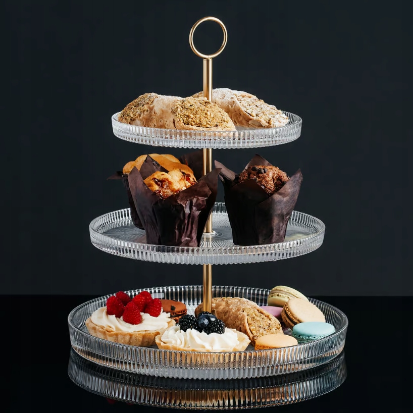 Trzy poziomy umożliwiają efektowne podanie większej ilości smakołyków, jednocześnie oszczędzając miejsce na stole. Złote detale dodają luksusowego charakteru, doskonale komponując się zarówno z nowoczesnymi, jak i klasycznymi wnętrzami. Solidna konstrukcja zapewnia stabilność, a wygodny uchwyt ułatwia przenoszenie.