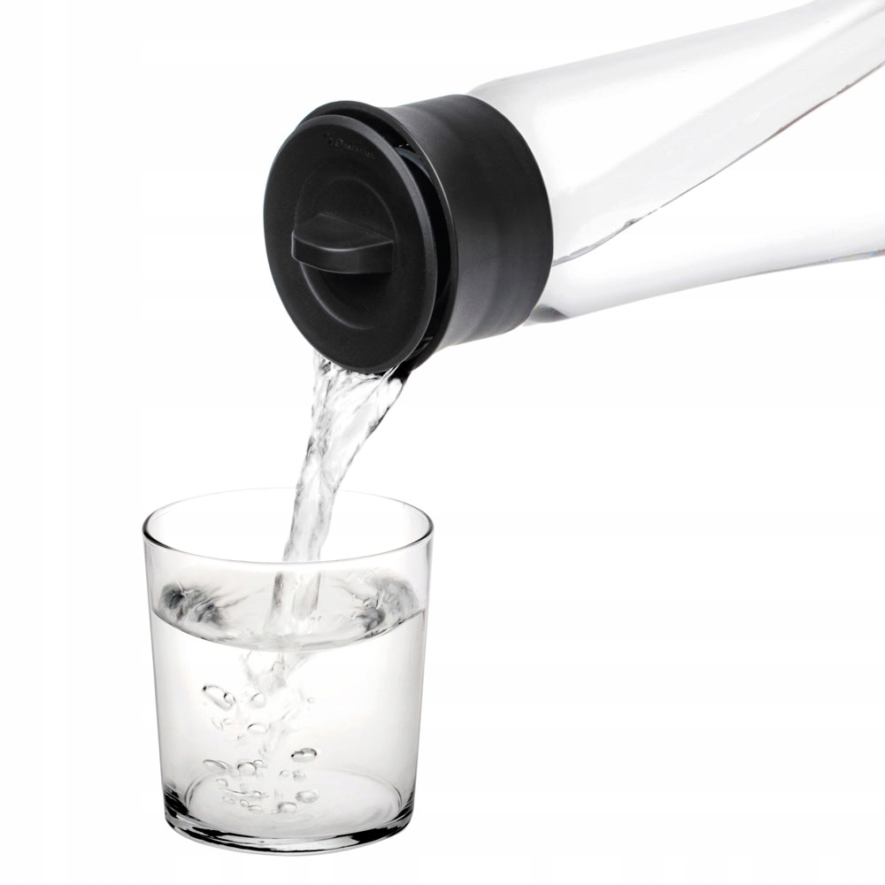 Jej powierzchnia jest idealnie gładka. Karafka Basic wyposażona w wygodną czarną hermetyczną pokrywkę, która zabezpiecza przed rozlaniem lub pochłanianiem zapachów z lodówki, wtedy napoje dłużej zachowują świeżość.