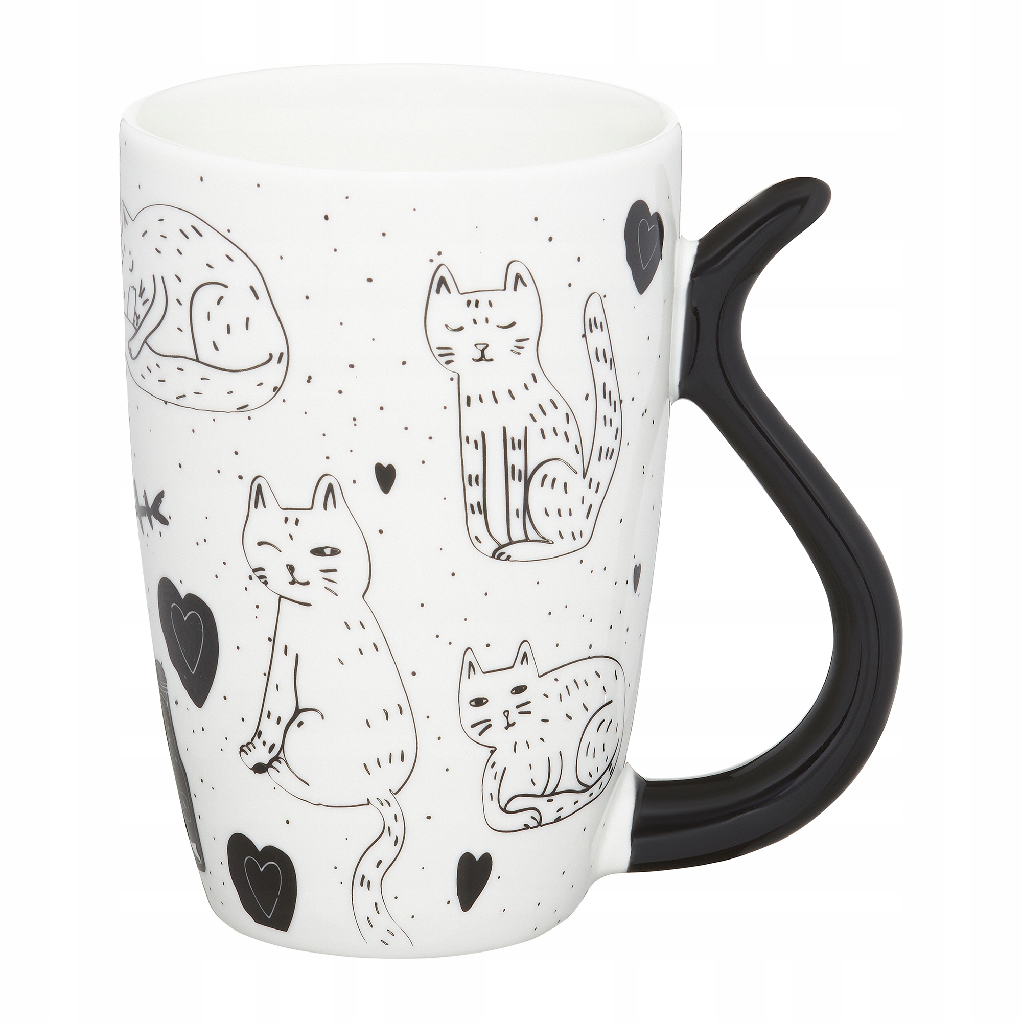 - Unikalny design: Wzór z uroczymi kotami i dekoracyjnym uchwytem w kształcie kociego ogonka, który dodaje kubkowi charakteru.