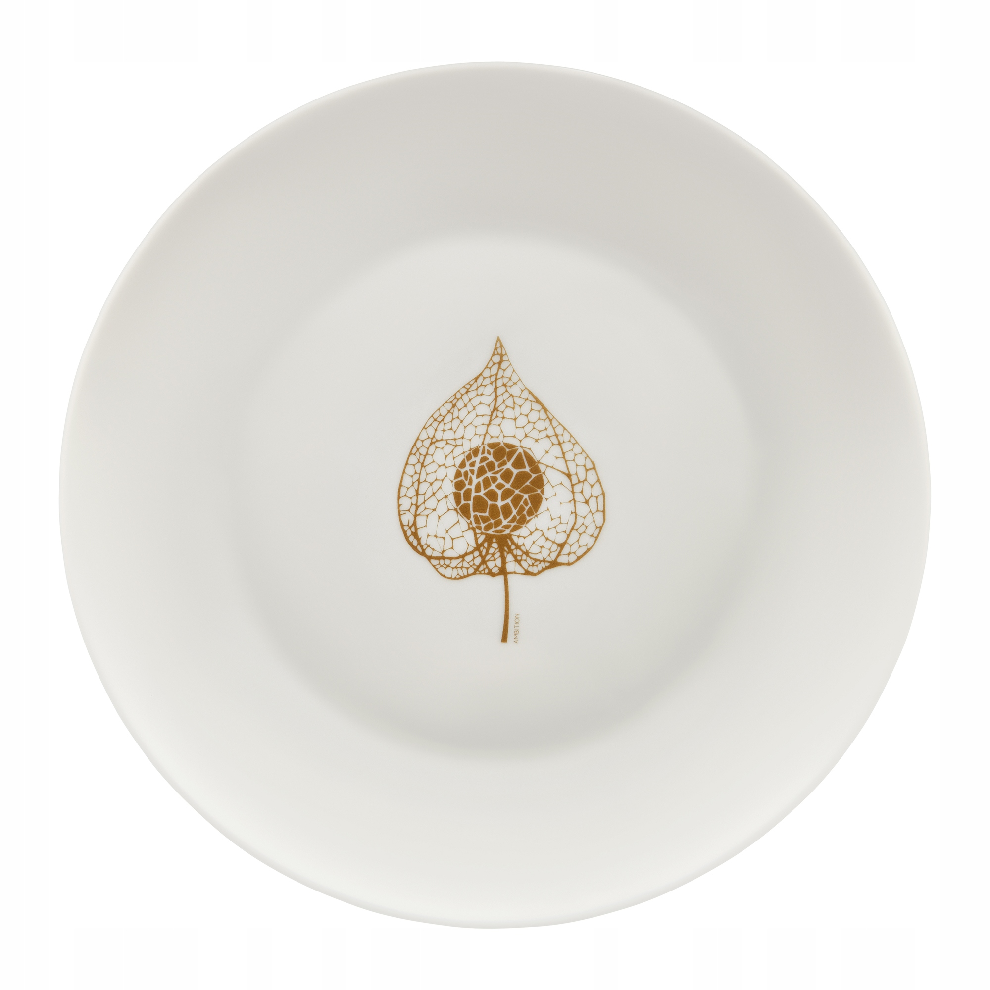 Okrągły talerz deserowy ozdobiony został subtelną dekoracją w stylu botanicznym. Polecany szczególnie jako element śniadaniowej zastawy. Owoc miechunki przypomina koktajlowy pomidorek ukryty w złotej osłonce. Ten ażurowy lampion ze złotej nici, wypełniony złotą kuleczką, świetnie wkomponowuje się na prostej, porcelanowej