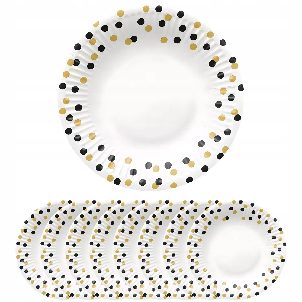 Talerzyki papierowe białe złoto-czarne konfetti 18cm 8szt