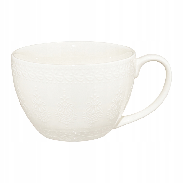 Duży porcelanowy kubek Galactic White. Wyróżnia się subtelnym, wytłoczonym wzorem paisley inspirowanym orientalnym motywem, co nadaje mu oryginalnego i stylowego charakteru.