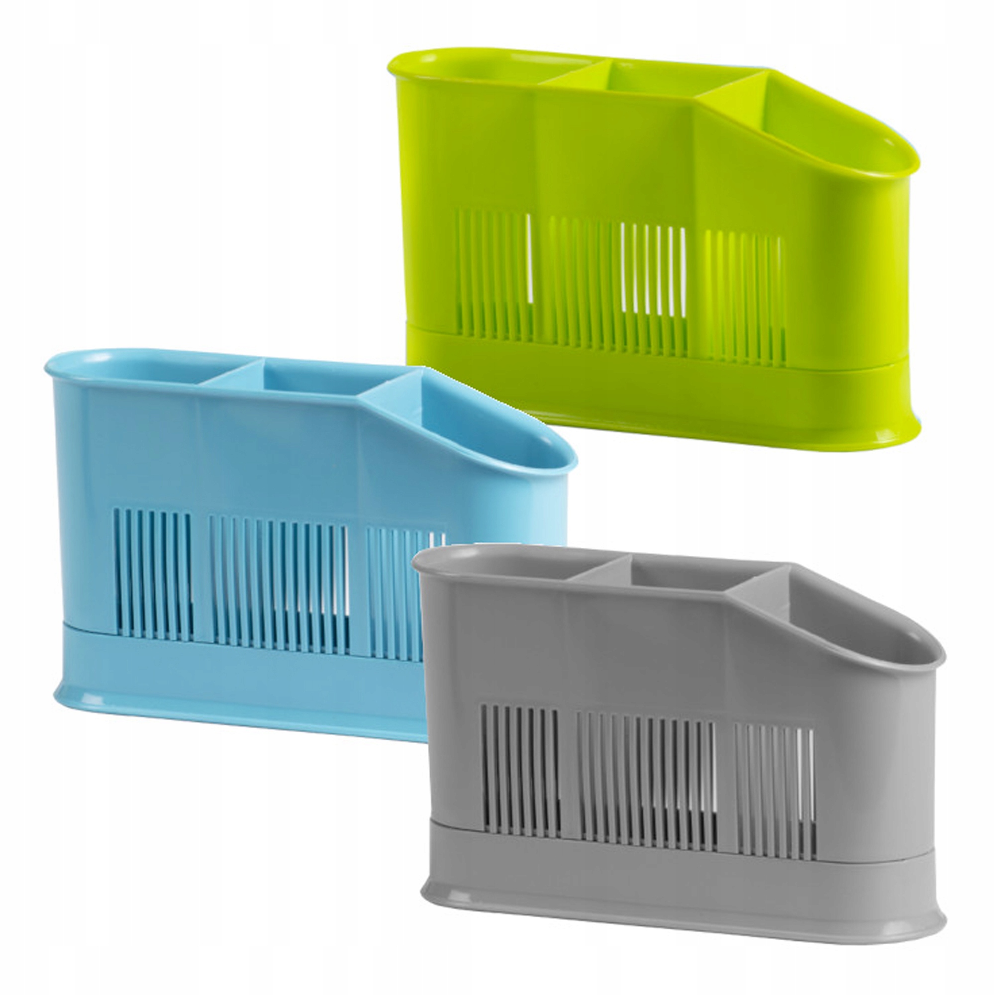 Ociekacz na sztućce z podstawką 3-komorowy, wykonany z tworzywa sztucznego w kolorze szarym. Trzy komory pozwalają na łatwy dostęp do sztućców o różnych rozmiarach oraz zapewniają stabilność przy suszeniu długich sztućców i akcesoriów kuchennych. Ociekacz posiada odczepianą podstawkę, która gromadzi nadmiar wody. Praktyczny i łatwy w utrzymaniu czystości.
