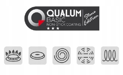 Wysokiej jakości powłoka nieprzywierająca Qualum Basic Stone Edition w połączeniu z grubymi ściankami i dnem, zapewniają gotowanie, smażenie, pieczenie bez przywierania.