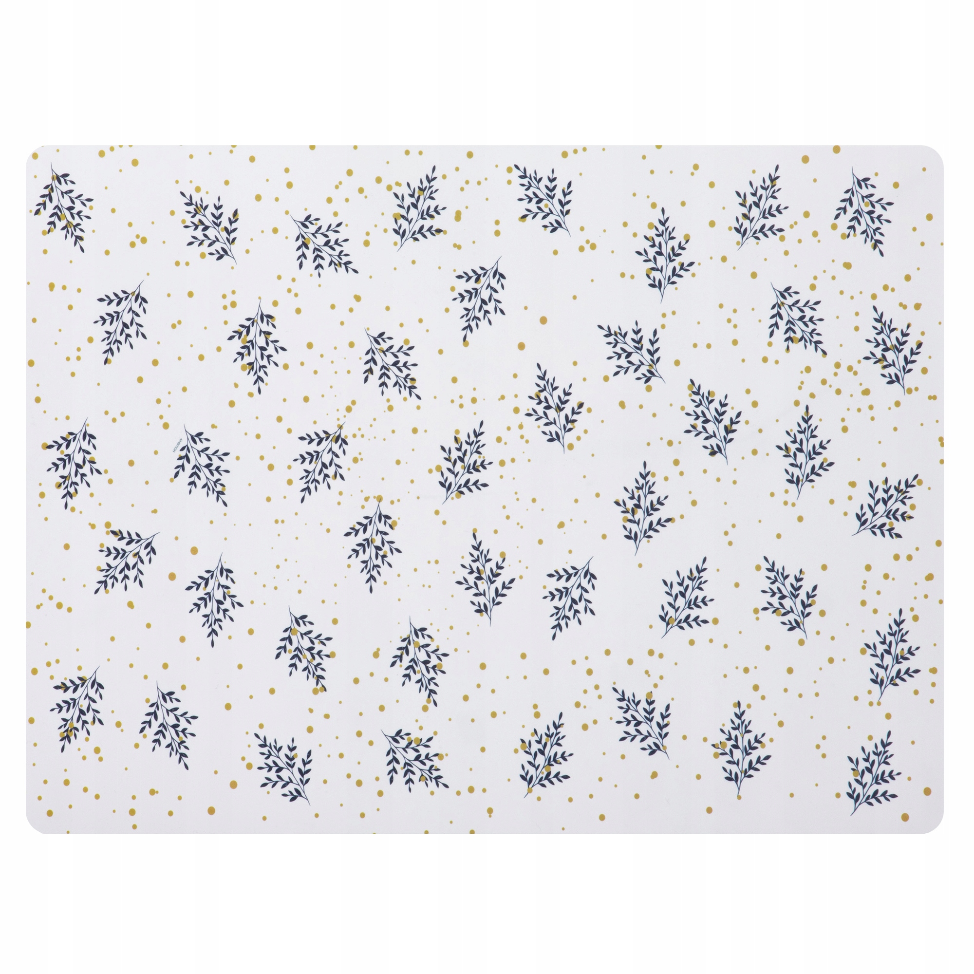 Podkładka marki AMBITION Galactic 40 × 30 cm Gałązki charakteryzuje się eleganckim niebieskim wzorem gałązek z akcentami złotych kropeczek, które dodają blasku każdemu stołowi. Wykonana z trwałego tworzywa sztucznego, jest odporna na wilgoć oraz łatwa w czyszczeniu, co czyni ją praktycznym dodatkiem do codziennego użytku, jak i uroczystych kolacji.