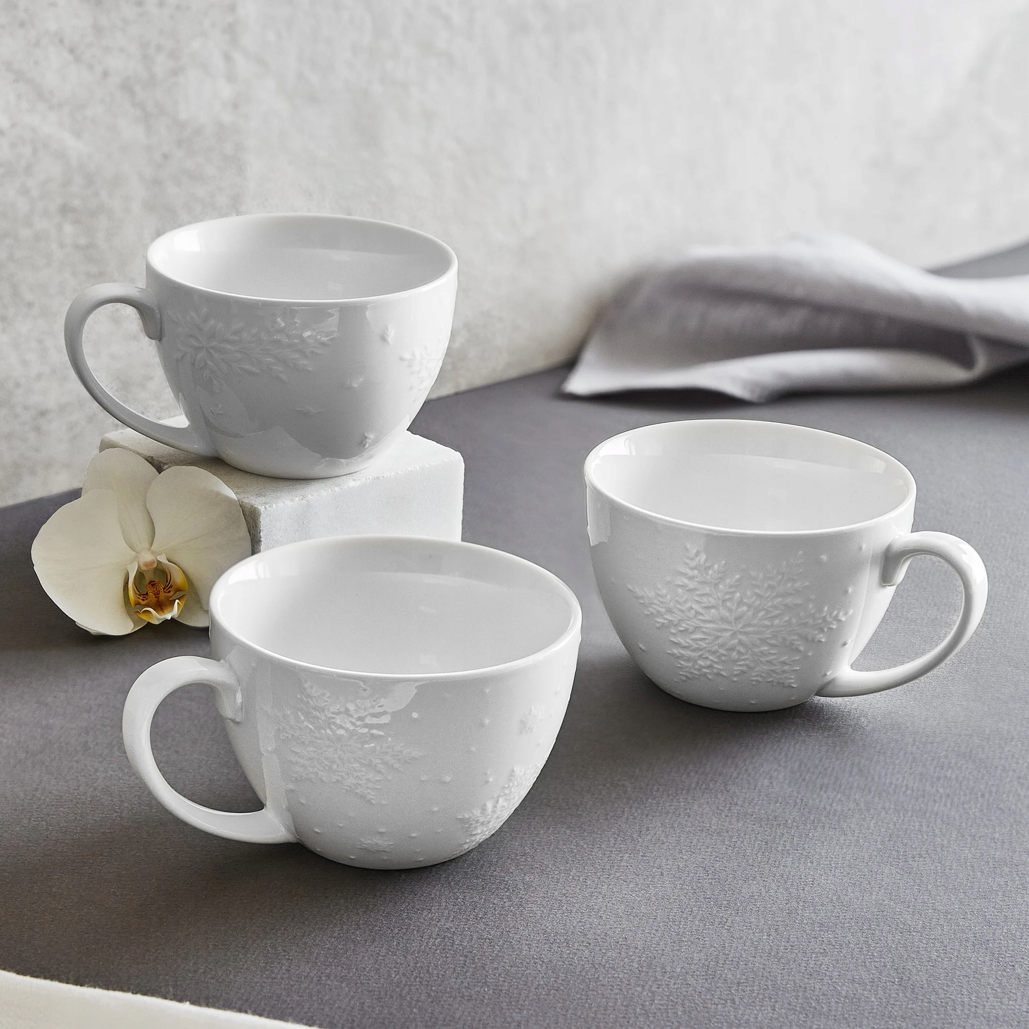 Kubek porcelanowy z serii Galactic marki Ambition. Seria naczyń stworzona w chłodnym, delikatnym stylu. Delikatne tłoczenia z płatkami śniegu nadają zimowego uroku. W serii dostępne są kubki, podkładki na stół, talerze deserowe oraz miseczki, które pięknie prezentują się w pięknym komplecie.