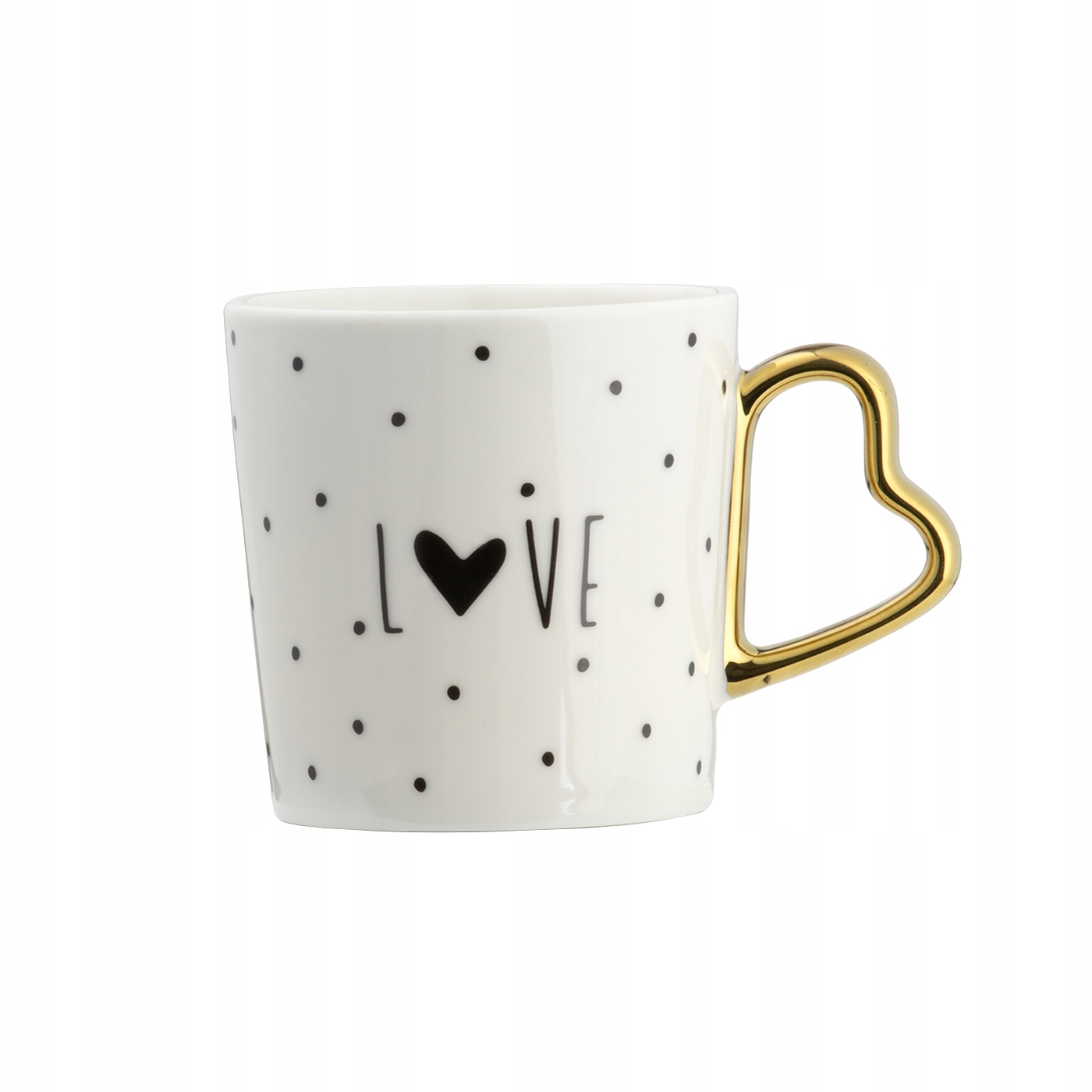 - Elegancki wzór: Subtelne kropki i napis "LOVE" z serduszkiem nadają kubkowi romantycznego charakteru.