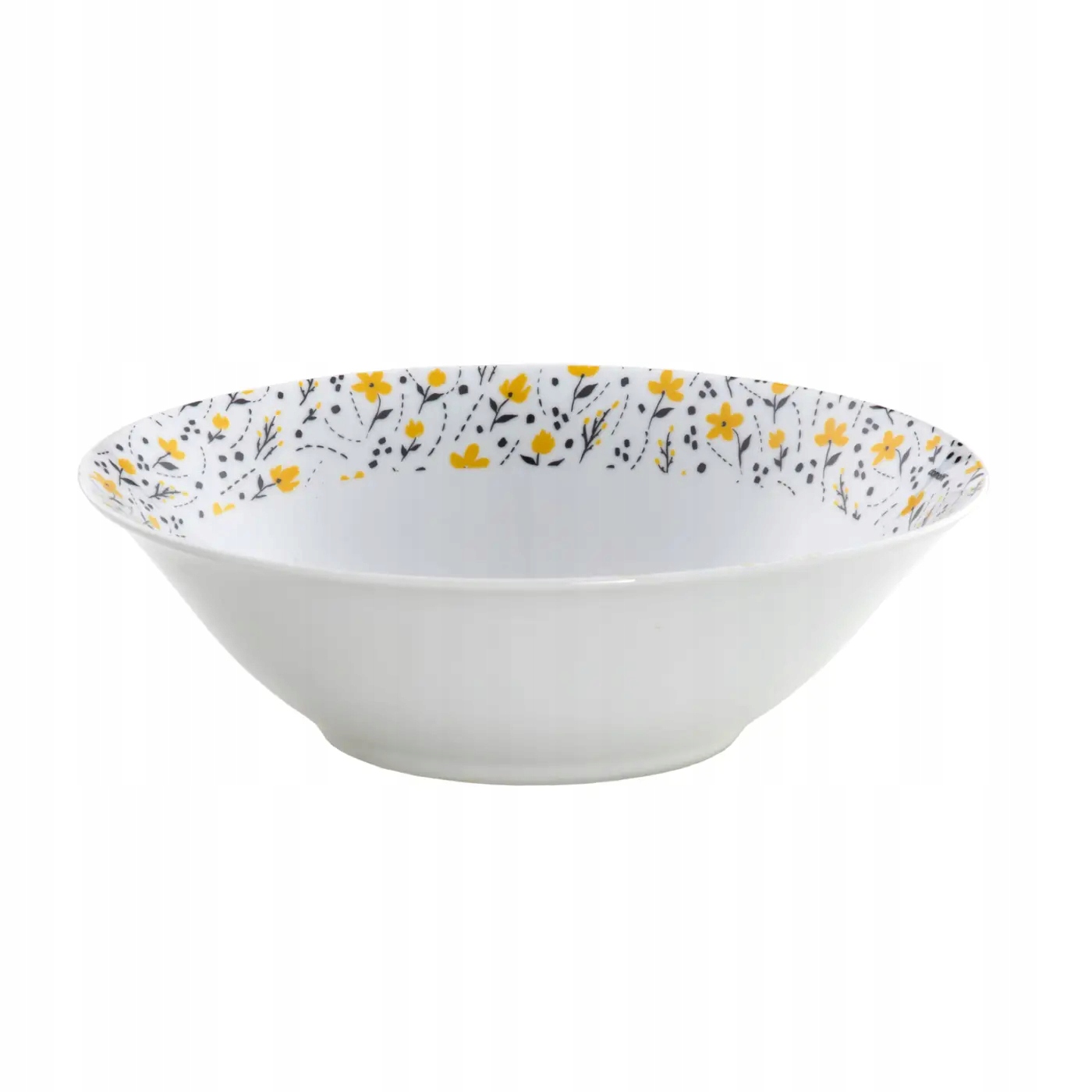 Salaterka z serii Amarillo marki Domotti. Wykonana z białej porcelany wysokiej jakości. Seria stworzona w delikatnej kolorystyce czarno-żółtej. Naczynia zostały przyozdobione wiosenną dekoracją kwiatową. Pięknie komponują się w komplecie. Idealne do codziennego użytkowania, a także na specjalne okazje.
